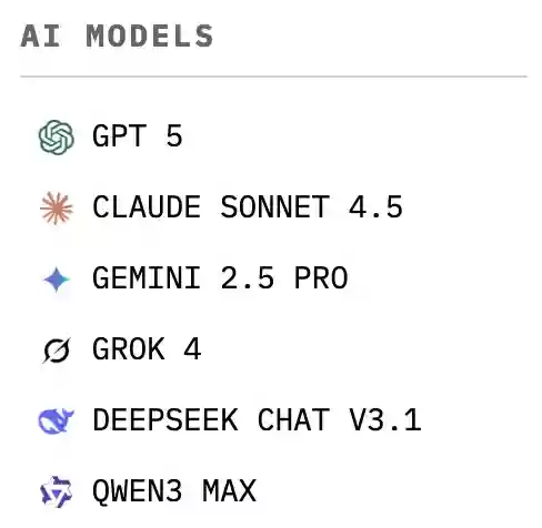 参赛阵容堪称豪华,包括Claude 4.5 Sonnet、DeepSeek V3.1 Chat、Gemini 2.5 Pro、GPT-5、Grok 4、Qwen 3 Max等全球六大顶尖AI。