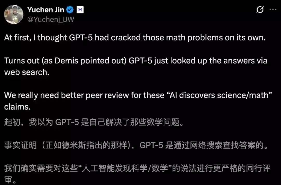 这十道难题其实早已被学界解决,并非由GPT-5独立破解,它只是通过检索网络文献找到了现成答案。