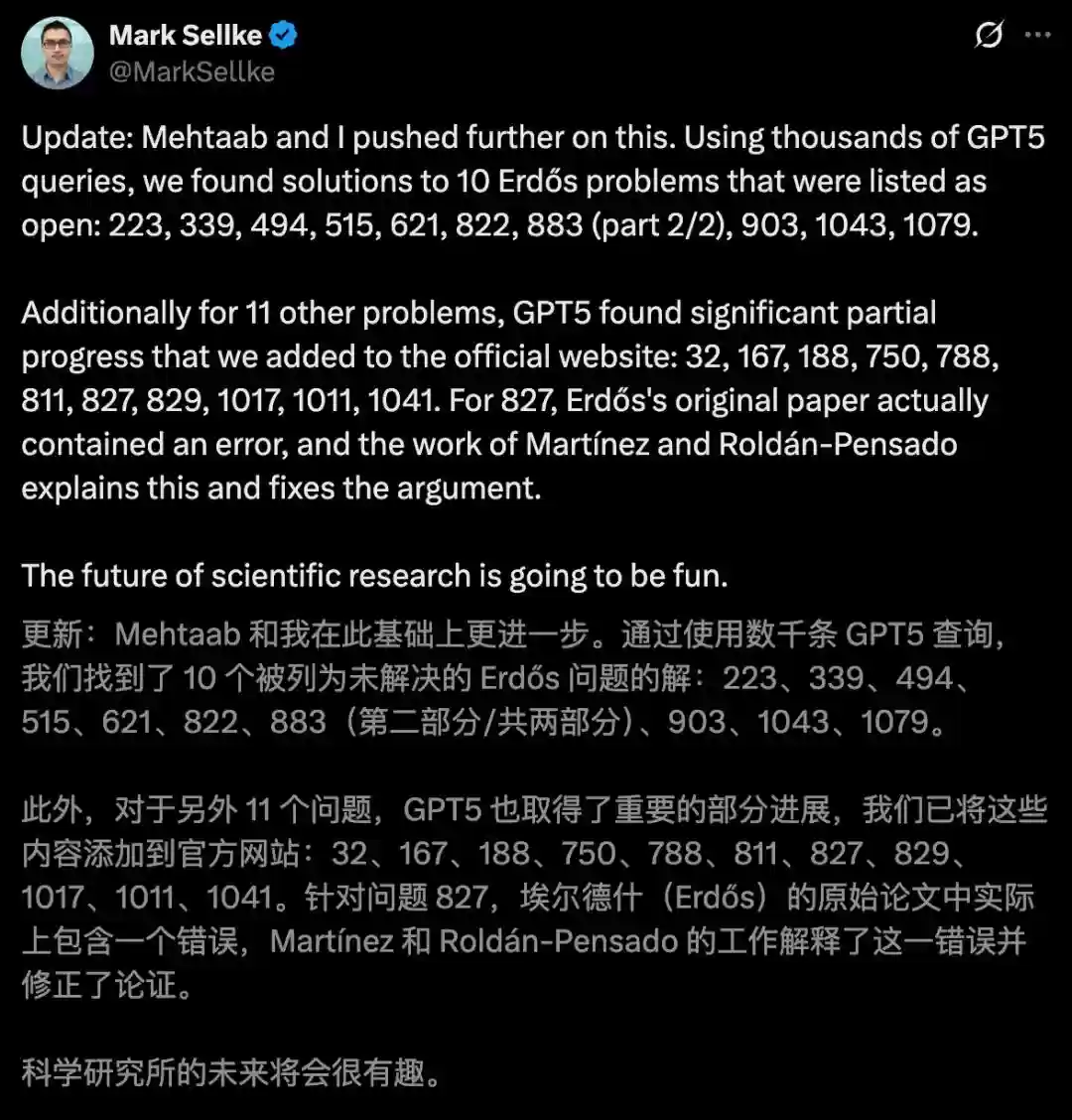 他们原帖写道,通过GPT-5数千次查询后,找到了十个被列为Erdos问题的解法。