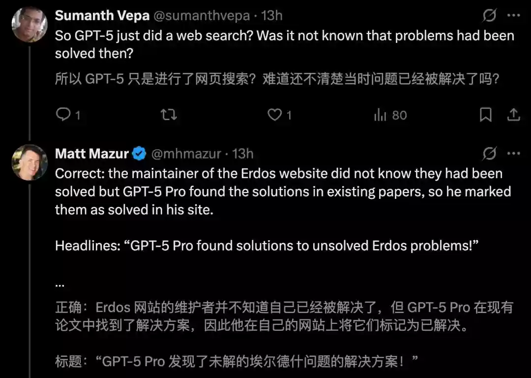 一方面,难题并非未解决,只是维护者不清楚;另一方面,GPT-5仅通过检索文献完成,而非自己解决。