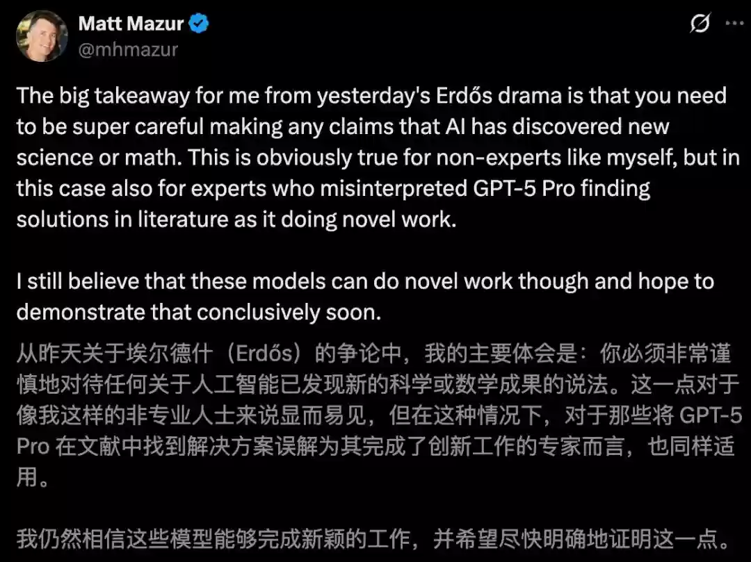 研究人员Mark Sellke和Mehtaab Sawhney在原文中明确表示,并没有声称GPT-5破解了这些难题。