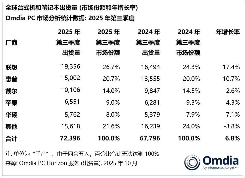 2025年Q3全球PC出货增长7% 联想市场份额再居第一