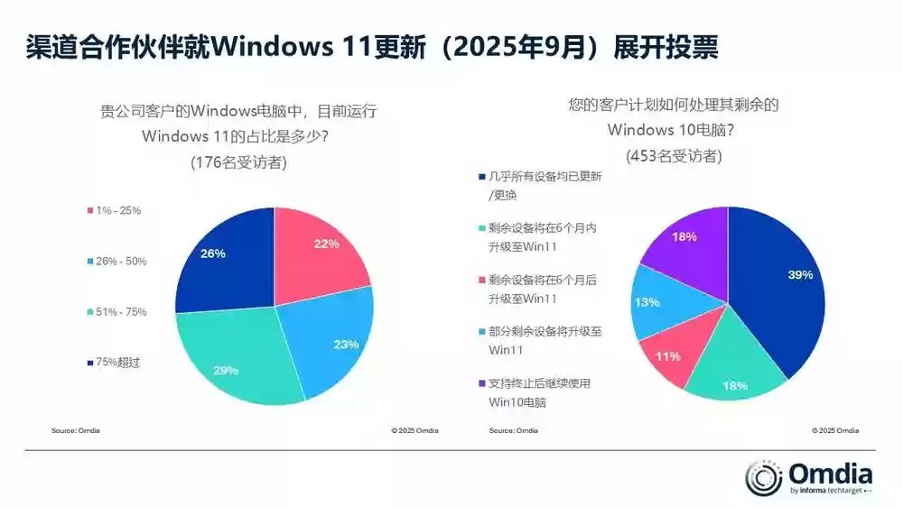 最新的PC渠道合作伙伴调查指出,在协助企业客户迁移至Windows 11系统方面,仍有大量工作需要推进。根据2025年9月的一项调研,在接受访问的453名业内人士中,仅有39%表示其客户使用的PC已基本全部完成系统更新或硬件升级。