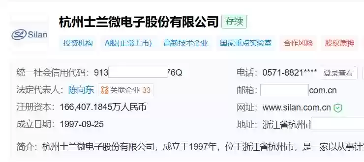 天眼查数据显示,士兰微成立于1997年,位于浙江省杭州市,2003年3月在上交所主板上市,是国内主要的综合型半导体设计与制造(IDM)企业之一,专注于硅半导体、化合物半导体产品的设计与制造,主要产品涵盖硅基集成电路、分立器件和化合物半导体器件(LED芯片及成品,SiC、GaN功率器件)。