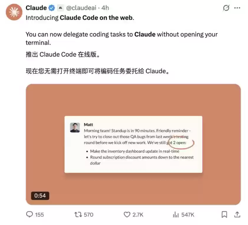 值得注意的是,Anthropic今日还正式推出了AI编程工具Claude Code的网页版本。用户现在可以直接通过浏览器委派编程任务,无需依赖本地终端环境,即可享受云端并行开发、实时进度追踪及安全沙箱运行等多项功能。这一举措进一步降低了Claude Code的使用门槛,或将使更多非专业编程人员也能从中受益。