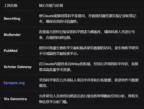 Anthropic最新推出的一系列连接器,旨在让Claude能够直接访问并操作专业科学工具与数据库,从而更深入地融入科研工作流程。这些连接器种类丰富,基本覆盖了当前主流的科学工具和数据库(见下表)。