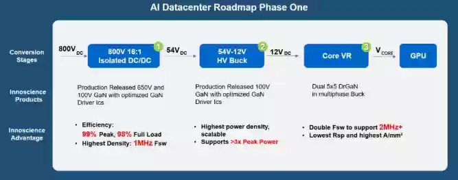 除了向800V机架电源过渡外,该架构还要求在800V至1V的电压转换过程中实现超高功率密度和超高效率。目前只有氮化镓功率器件能够同时满足这些严苛要求。