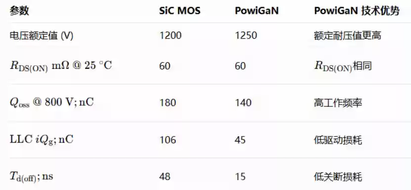 另外,与具有近似RDS的1200V SiC MOS相比,1250V PowiGaN可以实现更高频率的LLC,从而实现更高的开关密度。