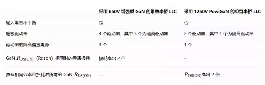 效率较低且成本较高:采用具有相似RDS的GaN器件时,与1250V PowiGaN单管半桥拓扑结构相比,堆叠拓扑结构会产生更高的导通损耗。这意味着1250V PowiGaN设计可采用RDS值高出2倍的器件,同时仍能实现相同的整体效率和损耗特性。