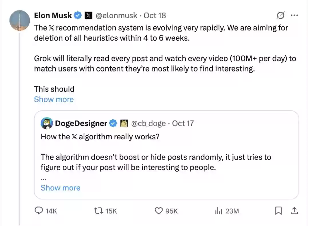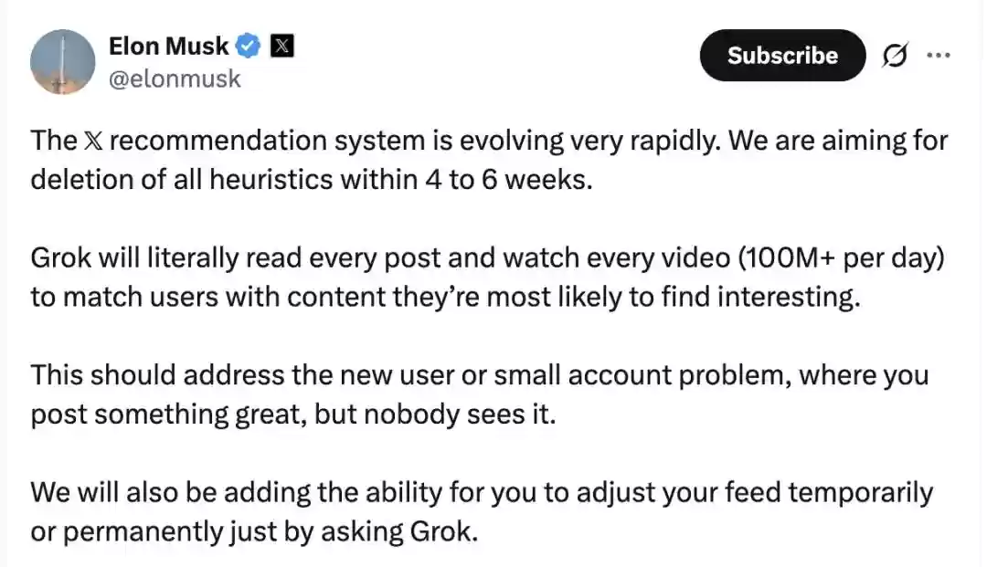 马斯克宣布:X(推特)将在未来几周内彻底取消启发式推荐算法,由Grok接手,通过阅读和观看平台全部内容来实现用户兴趣的自动匹配。