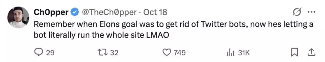 有意思的是,马斯克当初收购X时的目标,是清理平台上的机器人账号,让平台回归“真实对话”。而如今,他却让Grok接管了整个平台的信息流。