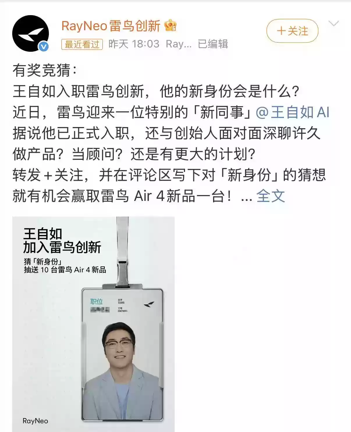 近日,AR领域备受关注的品牌雷鸟创新通过其最新官方渠道发布消息,证实数码圈知名人物王自如已正式加入公司团队,同时公开展示了其工作证件,但未对其具体职位进行详细说明。