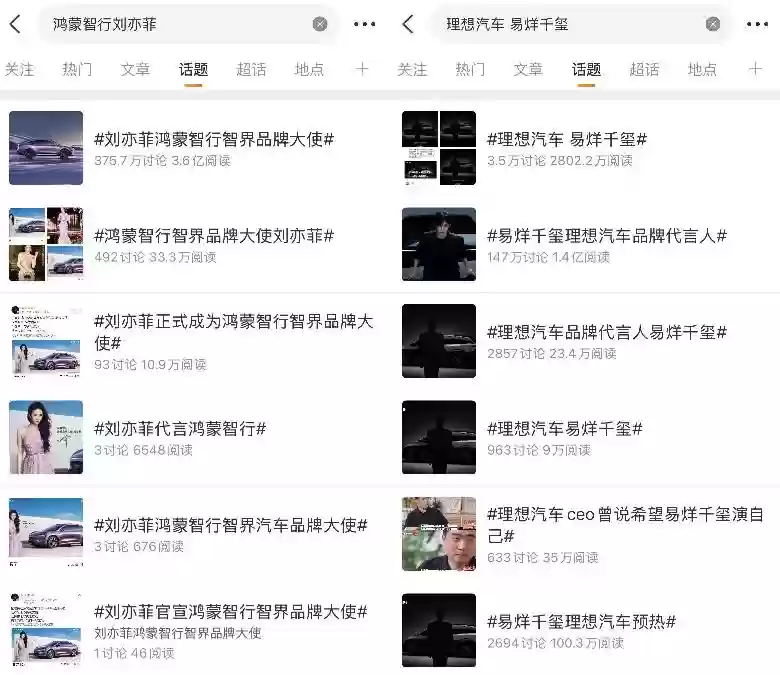 而借助明星的势能或网络热梗,往往能在一定程度上为品牌及新车赢得更多公众关注。比如此前鸿蒙智行邀请刘亦菲代言,截至目前,社交媒体微博上有关“刘亦菲鸿蒙智行品牌大使”的阅读量已超2.6亿,讨论量破百万。理想汽车和易烊千玺的合作,在微博上同样收获了破亿的阅读量和数百万的讨论量。