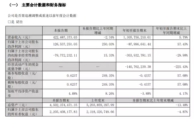 从年初至报告期末,公司累计营业收入为13.06亿元,较去年同期增长5.79%;不过在股东净利润方面,公司报告期内录得-0.88亿元。