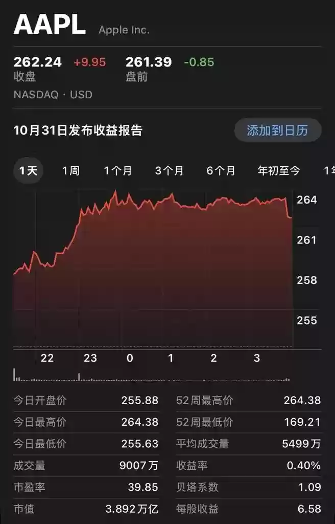 截至10月21日美股收盘,苹果每股报262.24美元(约合人民币1866.75元),单日涨幅达3.94%,总市值攀升至3.89万亿美元。与前一交易日收盘价相比,苹果单日市值激增约1475亿美元(约合人民币10502亿元)。
