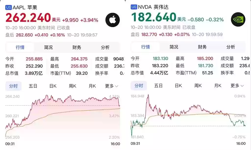 10月21日苹果与英伟达股价对比
