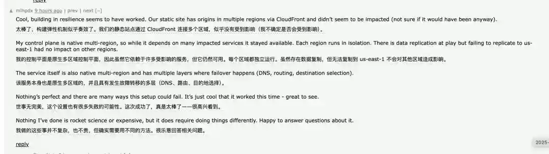 Hacker News上就有网友分享经验,称其静态站点通过CloudFront连接多个服务区域,而非将所有服务集中部署在us-east-1,因而在这次事件中几乎未受影响。