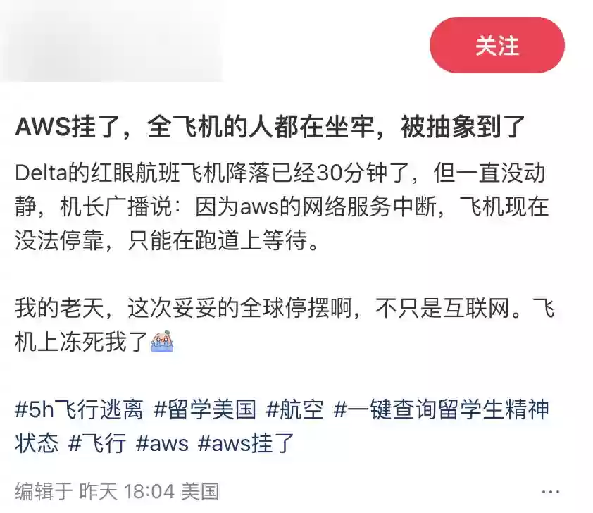 比登机更棘手的是下机难题。小红书上有网友分享经历,称自己乘坐的达美航空班机落地后无法停靠廊桥,全机乘客只能在跑道等待,机长广播通知的原因正是亚马逊服务器故障。