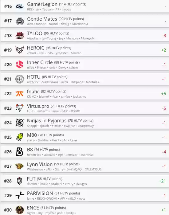 在21-30名区间,fnatic和FUT分别上升五位和二十一位,而Lynn Vision战队稍降一位,目前排名第27。当前Top30的守门员是ENCE战队。