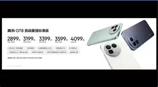 真我GT8标准版则以2899元起售价挑战行业性价比标杆。该机延续Pro版设计语言,提供怀特、纳维、格林三色可选,搭载同款2K+144Hz苍穹屏,采用Q10+京东方定制发光材料,支持3200Hz瞬时触控采样率,具备7000nit峰值亮度与2000nit全局亮度,配备圆偏光护眼技术与全亮度硬件级DC调光。性能方面采用骁龙8至尊版与电竞独显芯片R1双芯组合,搭配LPDDR5X内存和UFS 4.1闪存,配备7000mm²超大面积VC散热系统。影像方面,5000万像素主摄(1/1.56",OIS)搭载理光防眩光技术,支持理光GR影调系统,辅以800万像素超广角与500万像素潜望长焦镜头。该机玻璃版厚8.2mm、重214g,支持IP66/IP68/IP69三重防尘防水,配备3D超声波指纹、NFC和红外遥控,提供12GB+256GB(2899元)、16GB+256GB(3199元)、12GB+512GB(3399元)、16GB+512GB(3599元)及16GB+1TB(4099元)五种配置。