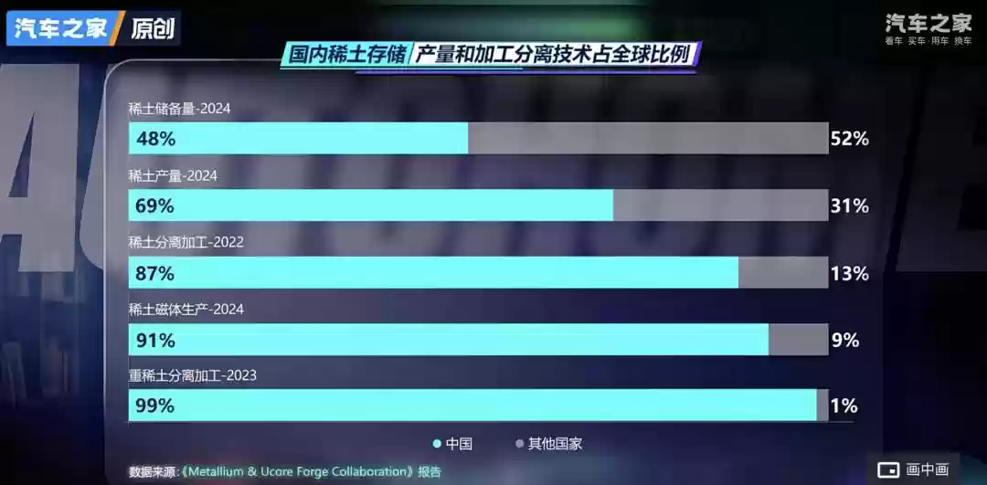 虽然全球稀土开采只有70%在中国,但近90%稀土分离加工和99%重稀土分离加工都被我国控制。