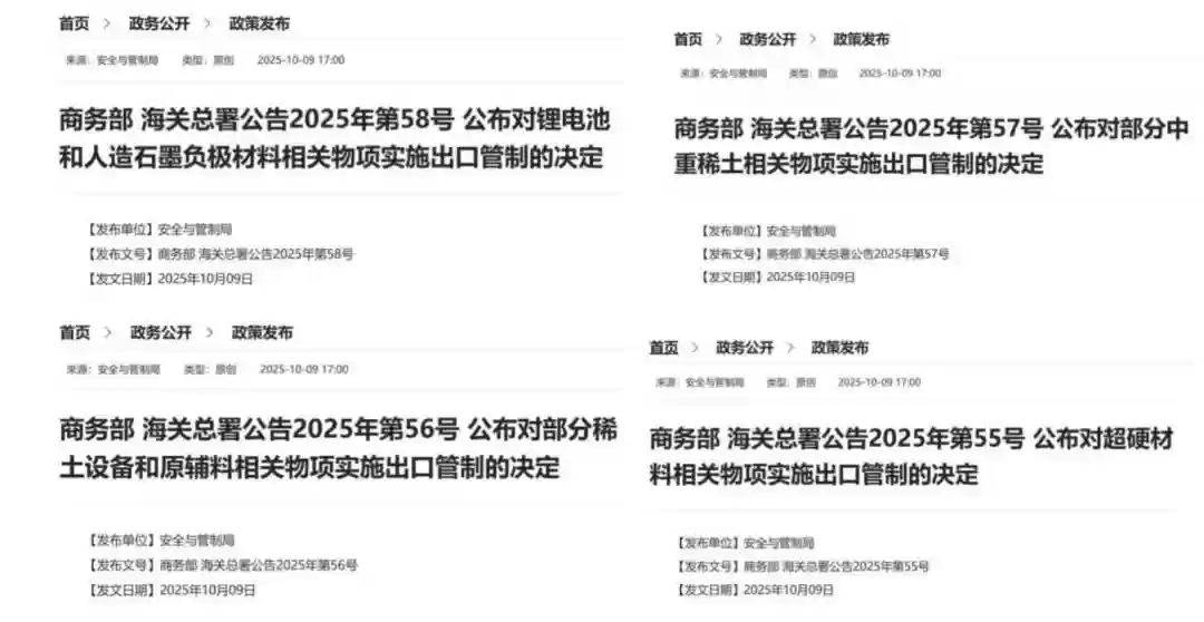 首先是稀土!从开采稀土的各种设备到稀土矿本身,再到钕等重要中重稀土,都被部分纳入出口管制范围。接下来是锂电池!将高能量密度锂电池本身以及生产它的正负极材料相关设备和技术,加入到管控中。最后,连超硬材料也被列入管制名单。以后出口这些"宝贝",就得先拿到"放行票"才行。