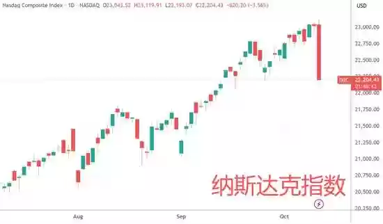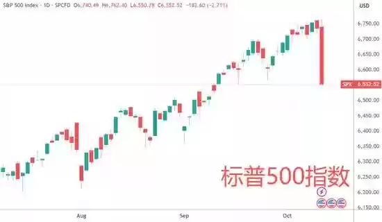 随之崩塌的还有全球股市。美股在10月10日经历了"黑色星期五",三大股指集体高台跳水,其中纳指、标普500创下4月以来最大单日跌幅。美国七大科技巨头市值一夜蒸发约7700亿美元(约合5.5万亿元),相当于跌掉了整整3个宁德时代。而节后A股也未能幸免,经历了大起大落的过山车行情。