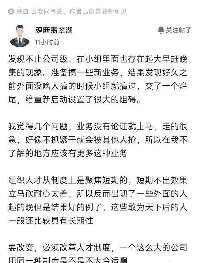 据发帖人描述,百度在多个新兴业务领域呈现出“起大早赶晚集”的现象。从社交产品到本地生活服务,从短视频到电商平台,公司虽多次布局前沿赛道,但多数项目在投入初期后便陷入停滞。这种“试错式”业务扩张模式,导致大量资源被消耗在尚未完成市场验证的领域。