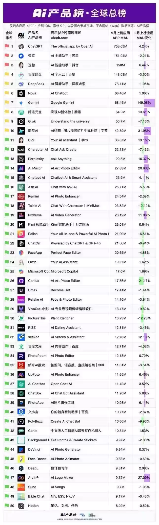 这种态势与全球市场形成鲜明对比。全球总榜单上,34个非中国产品中仅有5个属于“大厂”范畴,占比约15%。除了Gemini、Grok、Character.AI和Microsoft Copilot外,其余几乎全部来自小型团队或创业公司。比如高居榜首的ChatGPT,就出自明星初创企业OpenAI。