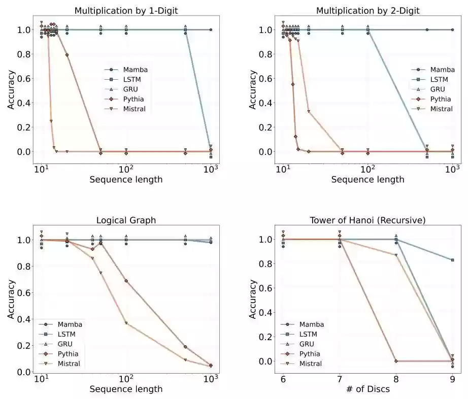 在逻辑推理及汉诺塔等需要分步规划的任务中,结合工具的Mamba能够应对更复杂的问题场景,Transformer则要么算得慢,要么直接卡住……