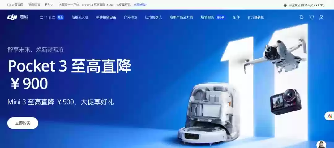 国庆长假结束后第一天,大疆就为“双11”大促拉开了序幕。这次促销覆盖了运动相机、全景相机、入门航拍机等多款影像产品,价格均出现显著下调,甚至连八月份刚发布的扫地机器人以及七月上市的全景相机也位列其中。