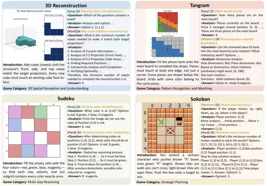 图1:GameQA数据集中涵盖的四类代表性游戏:3D场景重建、七巧板变体、数独游戏和推箱子挑战。每个游戏展示了两个视觉问答样例,包含当前游戏状态画面、对应问题,以及完整的推理步骤和正确答案。