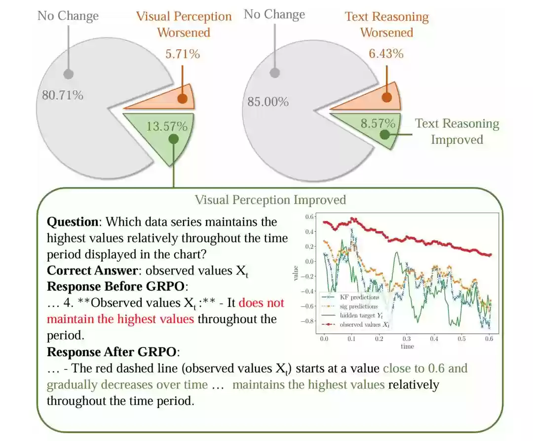 图6:人工定性分析显示,模型的视觉感知与文本推理能力均有提升。上方两个饼图分别展示了模型在跨域场景中视觉感知和文本推理能力的变化趋势,下方是视觉感知能力提升的一个典型案例。