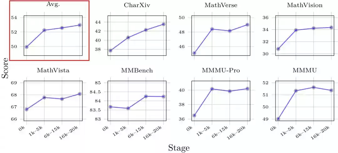数据量的规模效应:当训练使用的GameQA数据量增加到20K时,模型在通用推理基准上的表现持续提升,如图4所示。