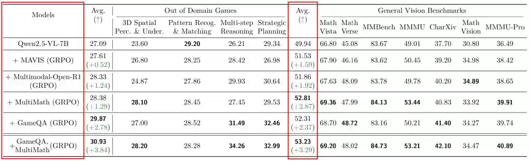 研究团队用GameQA与几何和图表推理数据集进行对比训练,结果发现GameQA训练出的模型整体表现极具竞争力。