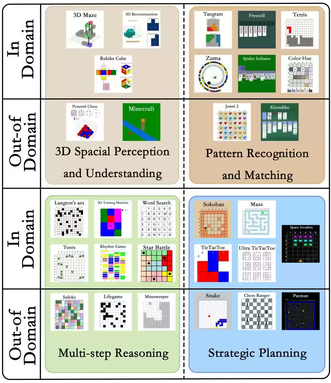 图3:GameQA包含的30款游戏,涵盖4个认知能力维度:3D空间推理、模式识别与匹配、多步骤逻辑推演、策略规划执行。其中20款领域内游戏用于模型训练,而10款领域外游戏专门用于评估模型在陌生游戏场景中的泛化能力。