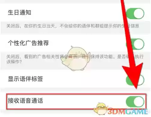 3、在设置界面中找到【接收语音通话】选项,点击其后的圆点开关