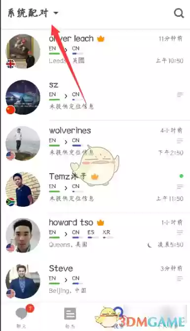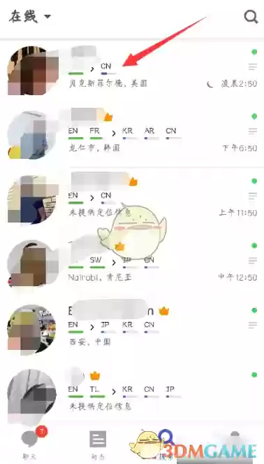 4、现在列表里显示的就全是正在线活跃的用户了,从中选择你想互动的对象。