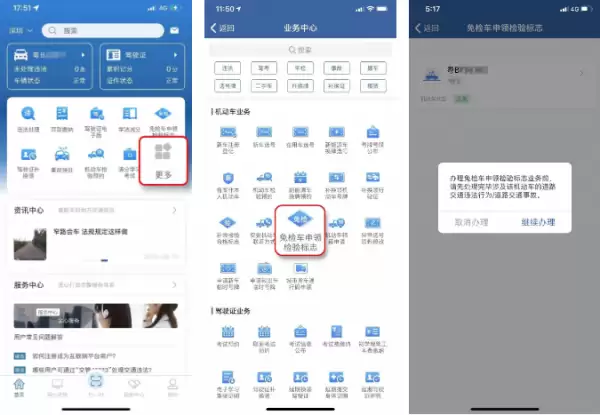 打开交管12123APP,依次点击【业务中心】-【免检车申领检验标志】,即可进入办理流程。