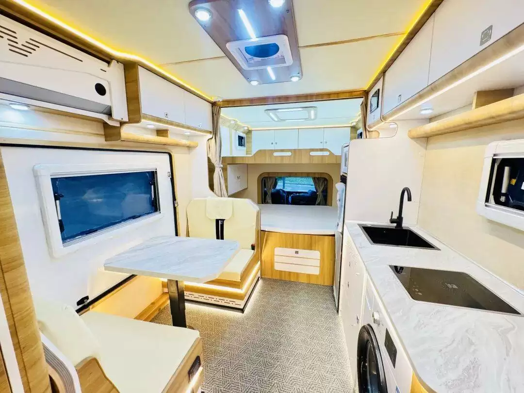 厨房区配备洗菜池、1000W电磁炉、微波炉及150L冰箱,满足基础烹饪需求,台面下8KG洗衣机解决旅途换洗难题。休息区采用双层床设计,下铺双人床与上铺额头床均配备透光窗与独立阅读灯,兼顾采光与夜间照明,营造温馨休憩环境。
