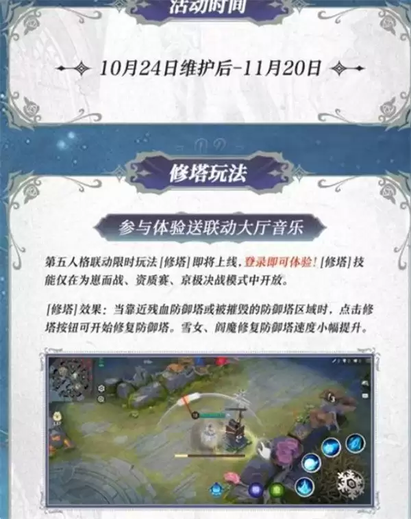 本次联动活动惊喜推出限时玩法“修塔”,玩家登录游戏即可参与体验。该玩法将在“为崽而战”、“资质赛”以及“京极决战”等模式中开放。当你靠近血量不足或被摧毁的防御塔时,轻轻点击“修塔”按钮便能立即启动修复。部分式神,比如雪女和阎魔,还能享受修复速度的额外加成,让战斗策略更加丰富多变。