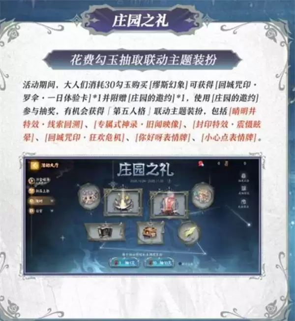 庄园之礼限时放送,活动期间,玩家只需消耗30勾玉即可购买“缪斯幻象”,获得“回城咒印·罗伞”一日体验卡,并额外赢得一次“庄园的邀约”抽奖机会。奖池中不仅有丰富的《第五人格》联动主题装扮,例如“晴明井特效·线索回溯”、“专属式神录·旧闻映像”、“封印特效·震慑眩晕”以及“回城咒印·狂欢危机”等限定奖励等你来拿。