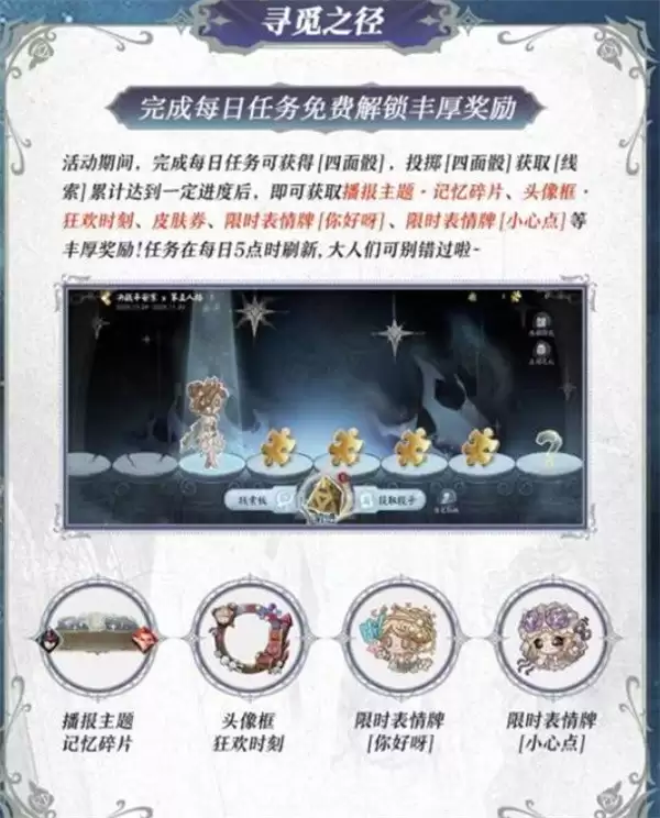 参与“修塔”玩法,不仅能获得“祈福绘马”、“花札”等活动道具,完成任务后还能免费领取联动限定BGM《最后的晚餐》。此外,活动期间完成每日任务,将获得“四面骰”,投掷后可收集“线索”解锁多重奖励,包括播报主题“记忆碎片”、头像框“狂欢时刻”、皮肤券以及限时表情牌“你好呀”和“小心点”等精彩内容。每日任务将于早上5点准时刷新。