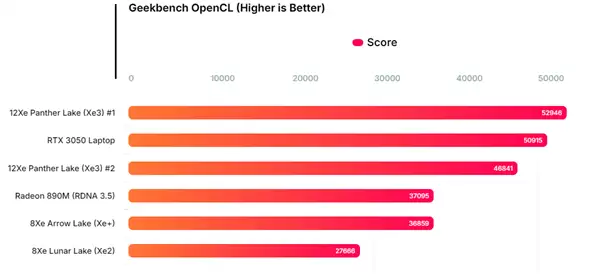 在Geekbench OpenCL测试中,酷睿Ultra X7 358H取得了52946分和46841分两个成绩,推测对应不同功耗模式或电源计划。与现有的8核Xe2架构集成显卡相比,这款12核Xe3核显的性能提升幅度在69%至91%之间,超越了英特尔此前宣称的50%性能提升目标。