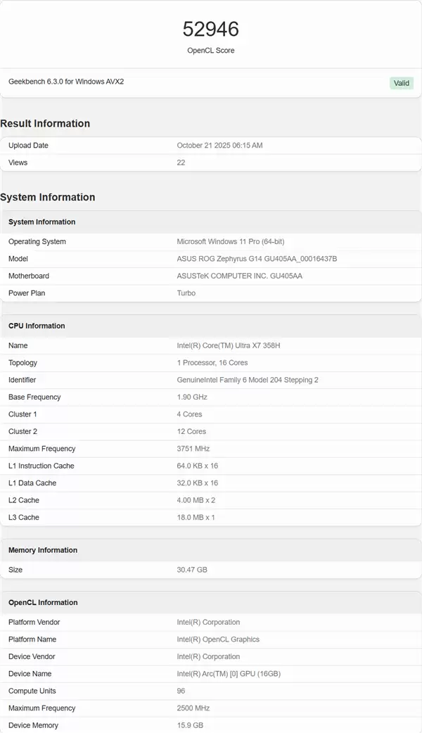 该处理器搭载于一款华硕笔记本电脑,采用16核CPU架构,包含4个性能核、8个能效核与4个低功耗能效核。其集成显卡为12个Xe3核心,运行频率达2500MHz。据推测,定位更高的X9系列频率有望进一步提升至2800MHz。