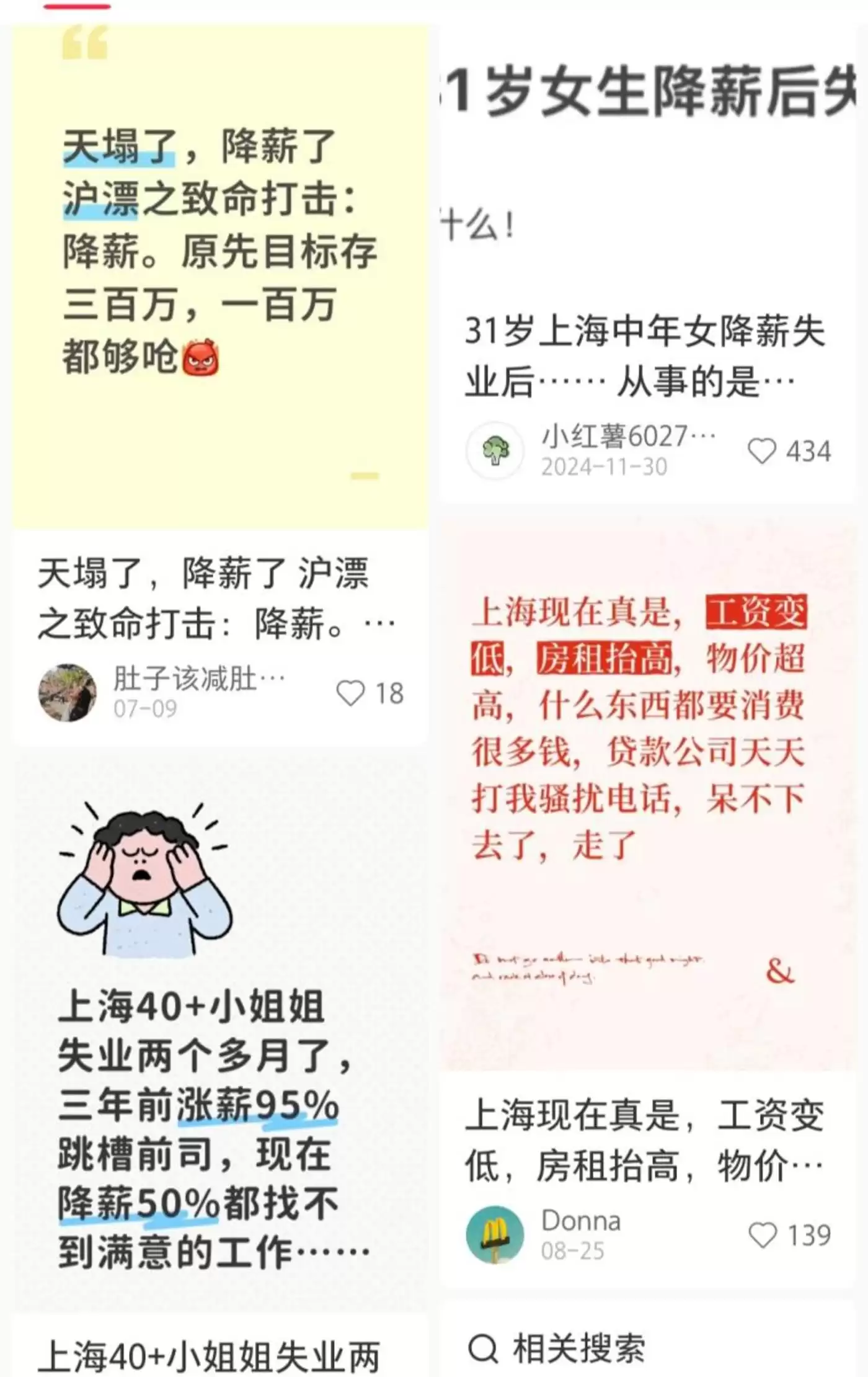 在小红书、抖音等社交平台上,城市打工人降薪或裁员的内容也受到大量关注。