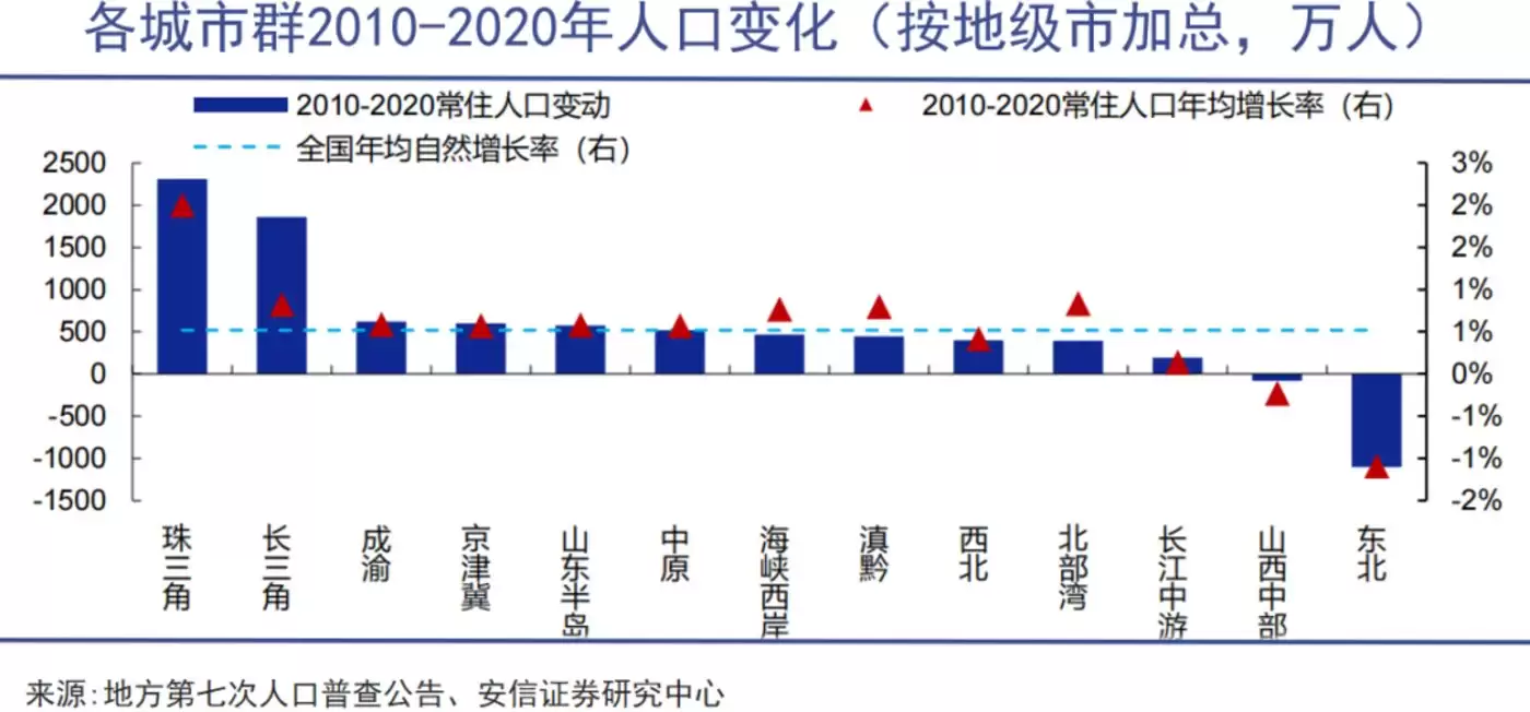 全国人口——尤其是年轻群体的流向——长期呈现出向大城市聚集的趋势。其中2010至2020年是一二线城市扩容的高峰期,珠三角、长三角等核心区域的常住人口增速远超全国自然增长率,而东北、西北等三四线城市集中的地区则持续面临人口净流出。