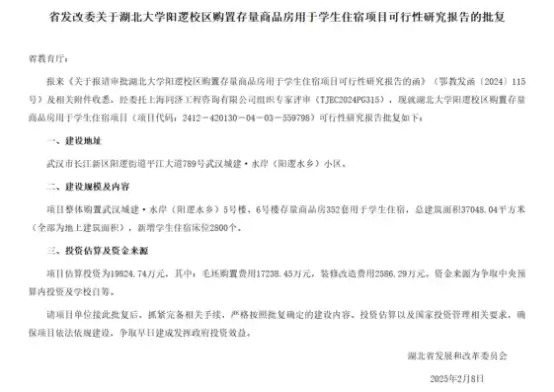 在省属高校中,湖北大学的举措也备受关注。该校于今年2月计划投资超1.9亿元,购入商品房房源改造后可新增约2800个床位。