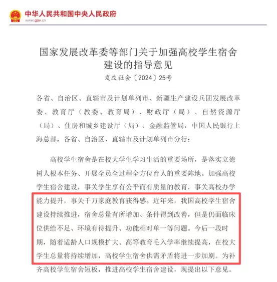 针对高校宿舍资源不足的问题,去年年初,国家发展改革委、教育部等七个部门联合印发了《关于加强高校学生宿舍建设的指导意见》,从筹资机制、资源渠道、配套政策、宿舍管理等多维度提出解决方案。其中提到,鼓励高校通过购买、租赁学校周边的人才公寓、商住楼等社会用房,补充宿舍资源,并按校内同等标准加强配套服务管理。