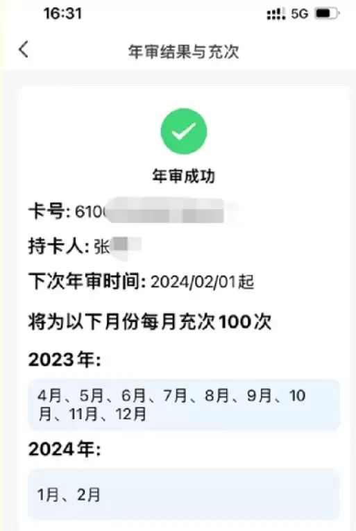 10. 充次完成后,页面将清晰展示本次充值的月份、剩余次数。您可通过上下滑动查看所有已充值的月份明细。